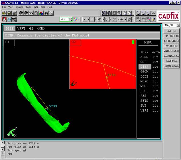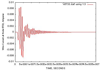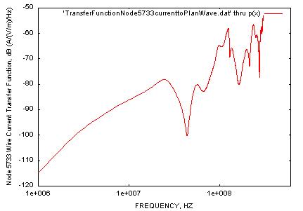 For this example, it is desired to determine the transfer function between the induced wire current at a certain location in a wire harness in the automobile (designated in this model as "node 5733"), and a plane wave incident from the top and polarized parallel to the car’s axis of travel. The screen shot above shows the automibile model with the location of node 5733 indicated. The three plots below illustrate the process. The first plot is of the time domain Gaussian pulse used as the incident waveform. The next shows the wire current computed at node 5733 by EMA3D. The EMA3D post processing utilities are used to easily compute the transfer function between the two waveforms, plotted in dB A/(v/m)/Hz in the third plot shown. Broadband spectral information is obtained with one time domain simulation.
